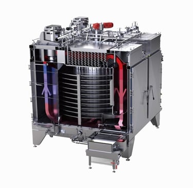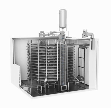 Spiral freezer systems are ideal for freezing, chilling, and processing a wide range of food products, including seafood, meat, poultry, prepared meals, fruits, vegetables, dairy, and bakery products. Using advanced IQF technology, products are conveyed on a spiral belt while high-velocity cold air circulates evenly to ensure rapid and consistent freezing.