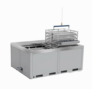Plate freezers use direct contact freezing to rapidly process large volumes of food products and liquids, ensuring high efficiency, consistent quality, and food safety.