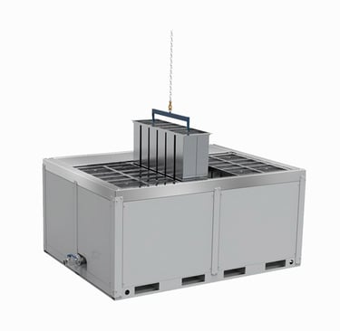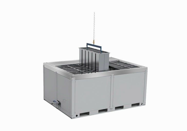 Plate freezing systems use direct contact freezing technology to rapidly process large volumes of food products and liquids, ensuring consistent quality and food safety.